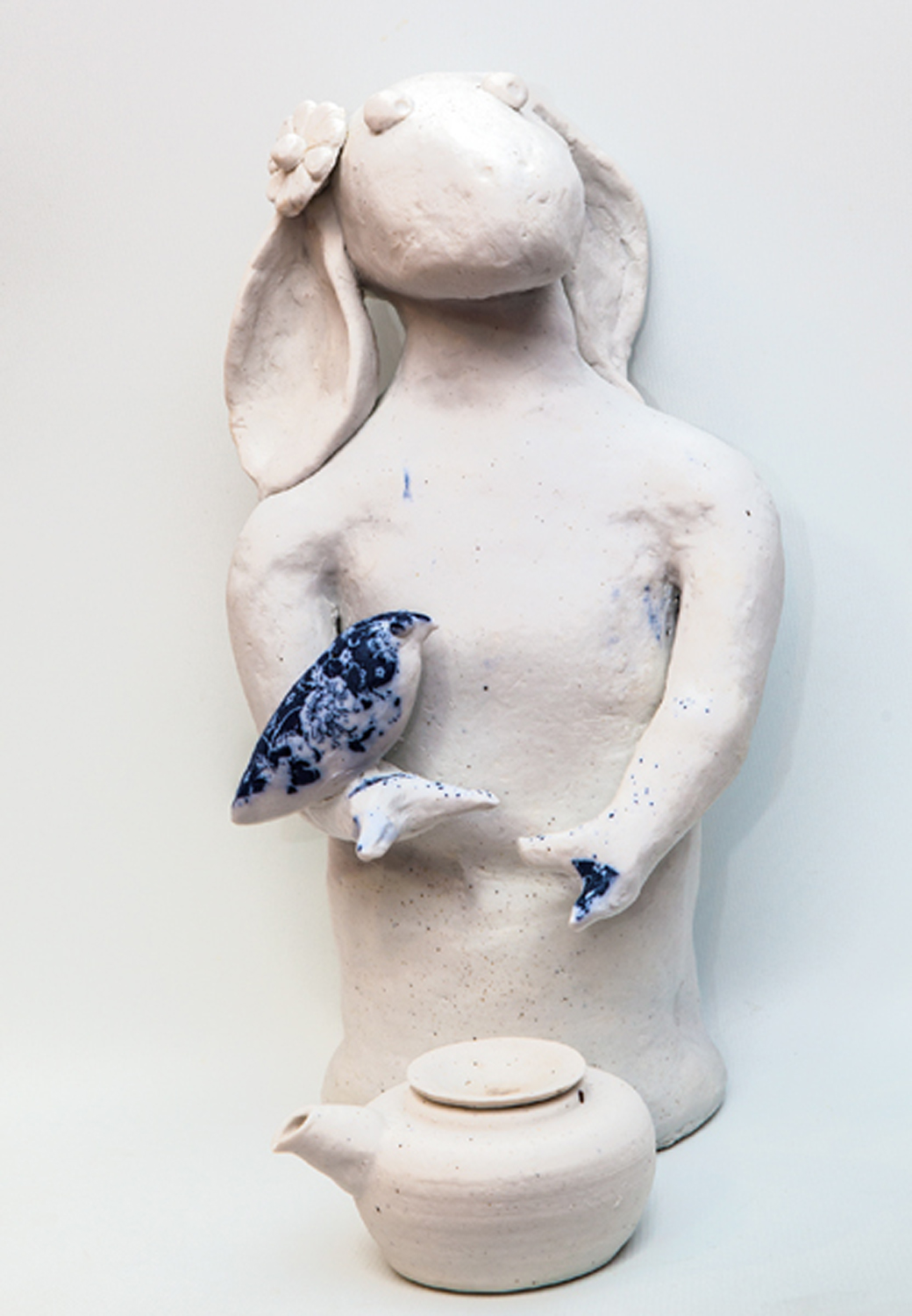 Then there is Anjani Khanna’s ceramic sculpture intriguingly titled Be Sure to Wear Flowers in Your Hair. “I grew up in the 1960s and 1970s, the younger by six years, of two siblings. As a result I was exposed to the Beatles, Joan Baez, Joni Mitchell, the Doors, and Bob Dylan amongst others at a very young age. Through my growing years, mother would refer to me as a lotus eater. Eventually I found my way to Pondicherry and clay and the Golden Bridge Pottery, run by the original Californian flower children Ray Meeker and Deborah Smith, who had journeyed to India in search of a gentler way of life. They had a tremendous influence on me and the choices I have made. The philosophical basis for the ceramic sculpture I make – yalis, as I refer to them, is deeply influenced by a world view where reductive dichotomies are eschewed in preference for a softer, more inclusive composite understanding and the power that that can wield.”
