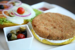 Apply mayonnaise, tomato and cucumber on one half of the burger.