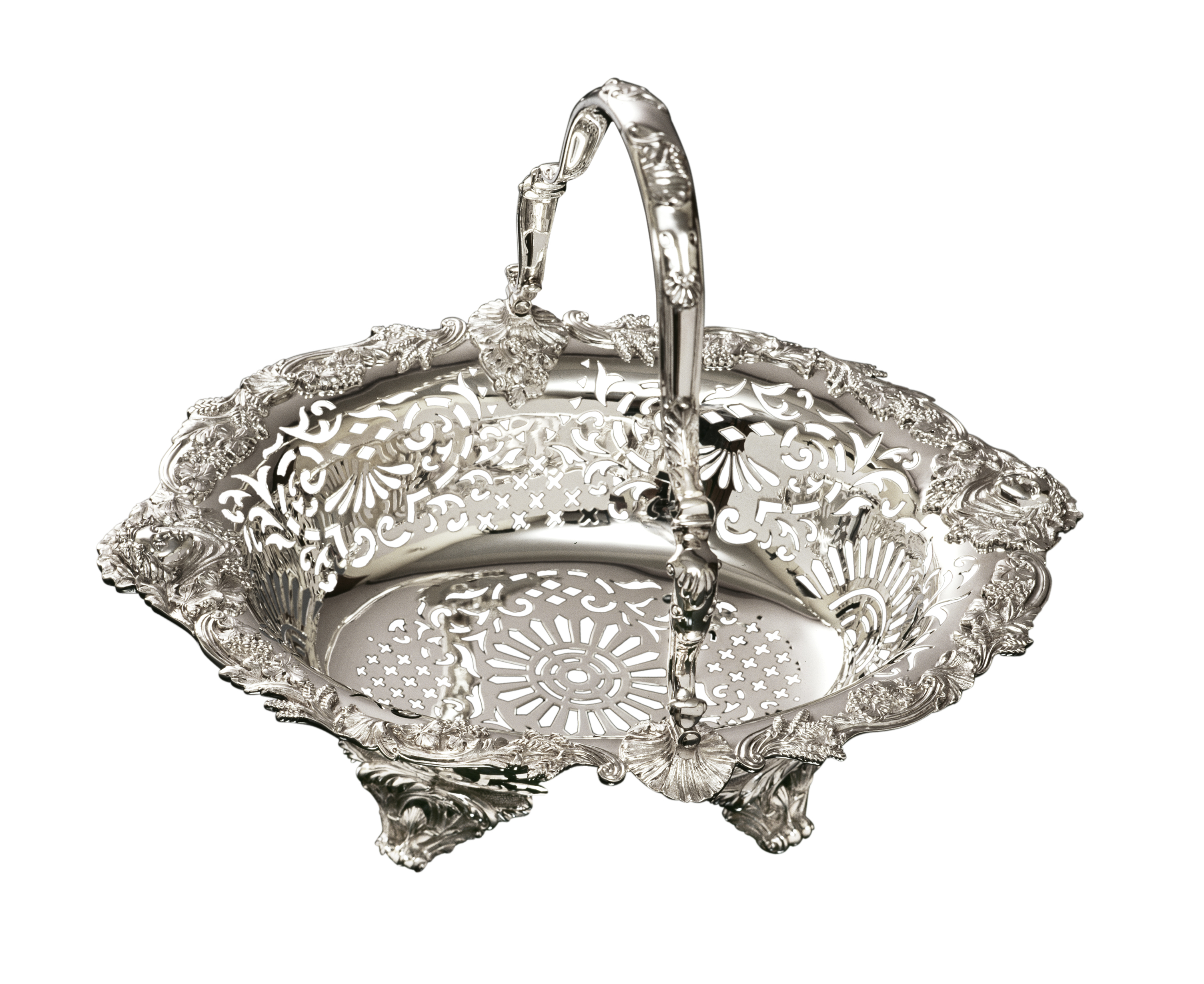 This bread basket with a swing handle is decorated with Victorian motifs and intricately hand-pierced. Hand crafted in sterling silver, very English in style.