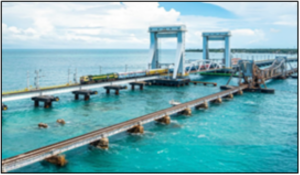 The newly constructed Pamban Bridge, connecting Rameswaram with the mainland, is India’s first vertical lift railway sea bridge. It has emerged as a standout symbol of modern Indian infrastructure on the world map. Built at a cost exceeding Rs. 700 crore, the 2.07 km structure includes a 72.5-metre vertical lift section that can rise 17 metres, allowing ships to pass safely without halting train movement.